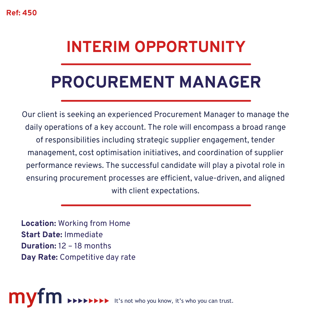 Our client is seeking an experienced Procurement Manager to manage the daily operations of a key account. The role will encompass a broad range of responsibilities including strategic supplier engagement, tender management, cost optimisation initiatives, and coordination of supplier performance reviews. The successful candidate will play a pivotal role in ensuring procurement processes are efficient, value-driven, and aligned with client expectations.